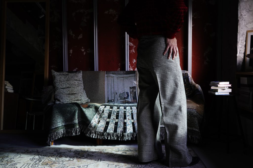 「PT10」は2種類の素材で展開。右側が、上の写真で僕が穿いている白黒いチェック、ざらっとしたウール100%。左がカシミヤ混でネイビーのオーバーペンが切ってある、滑らかな生地。青っぽく見える分だけ、白黒よりもさらにソフトな見え方。