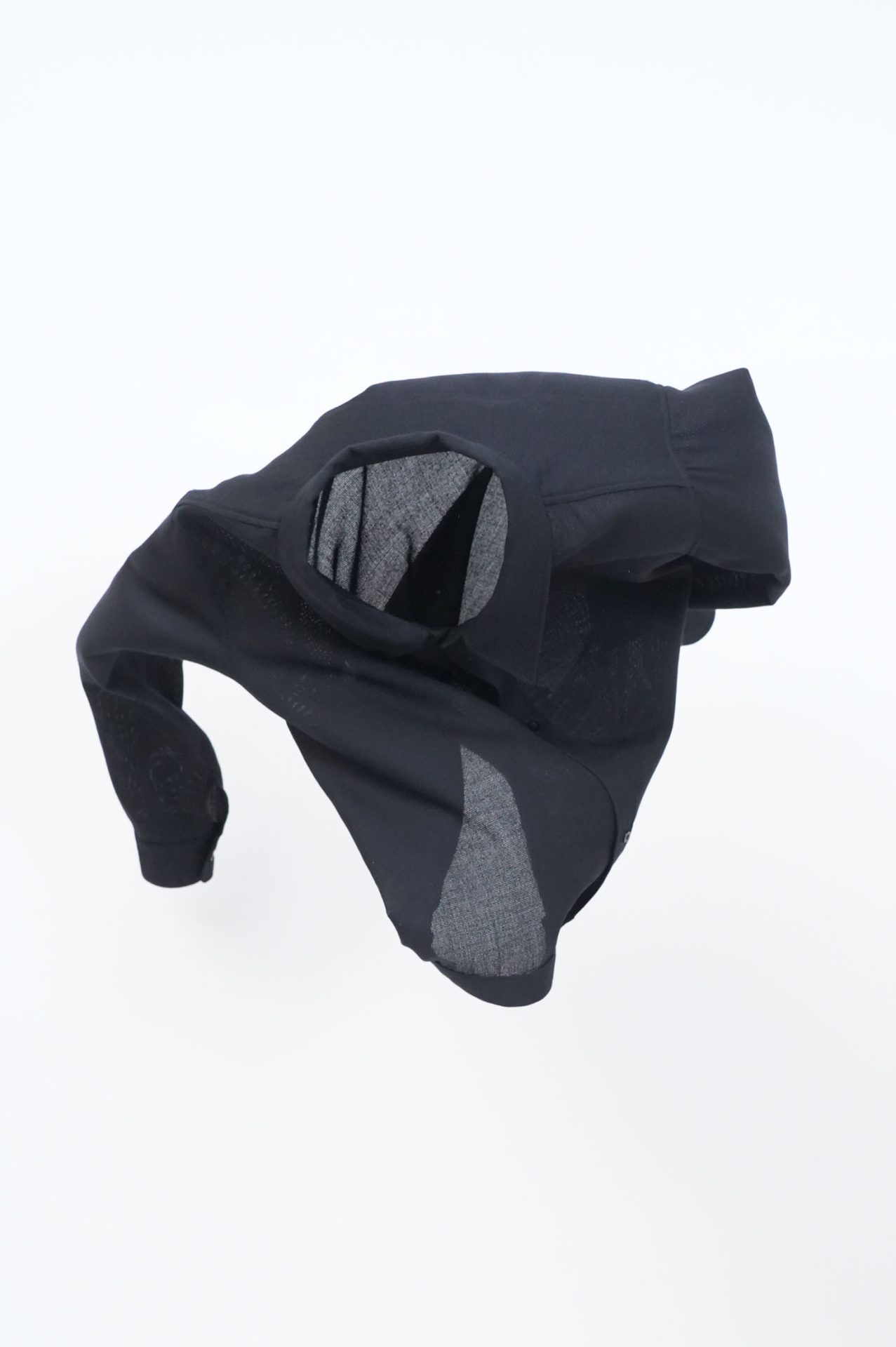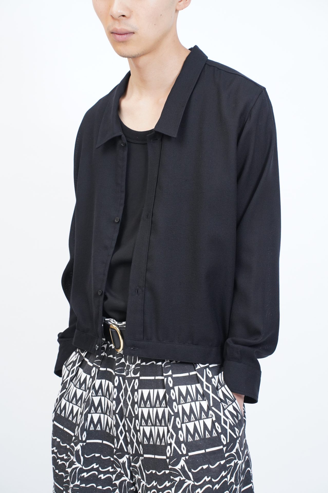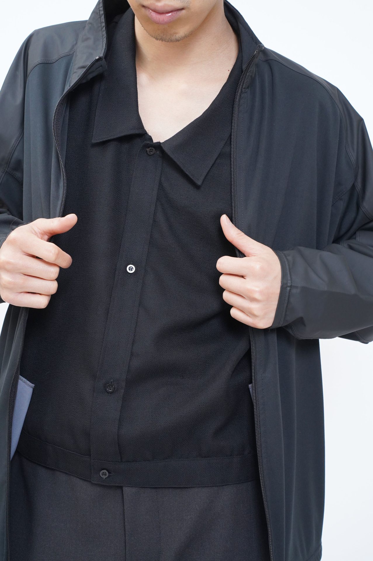 黒い洋服特有の雰囲気を纏いながら、その揺れやふくらみが柔らかな……コントラスト。 肩に掛けておいたり鞄に忍ばせたり。そんな想像も容易な軽さと、決して「涼しい見た目だけの洋服」にはならない絡み織りウール。はんなり。