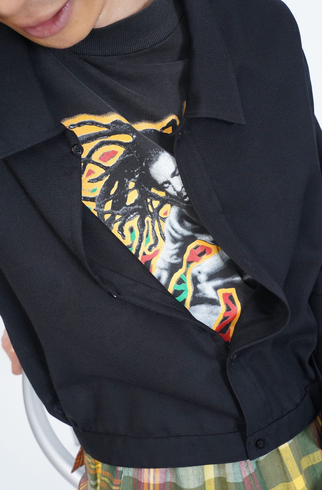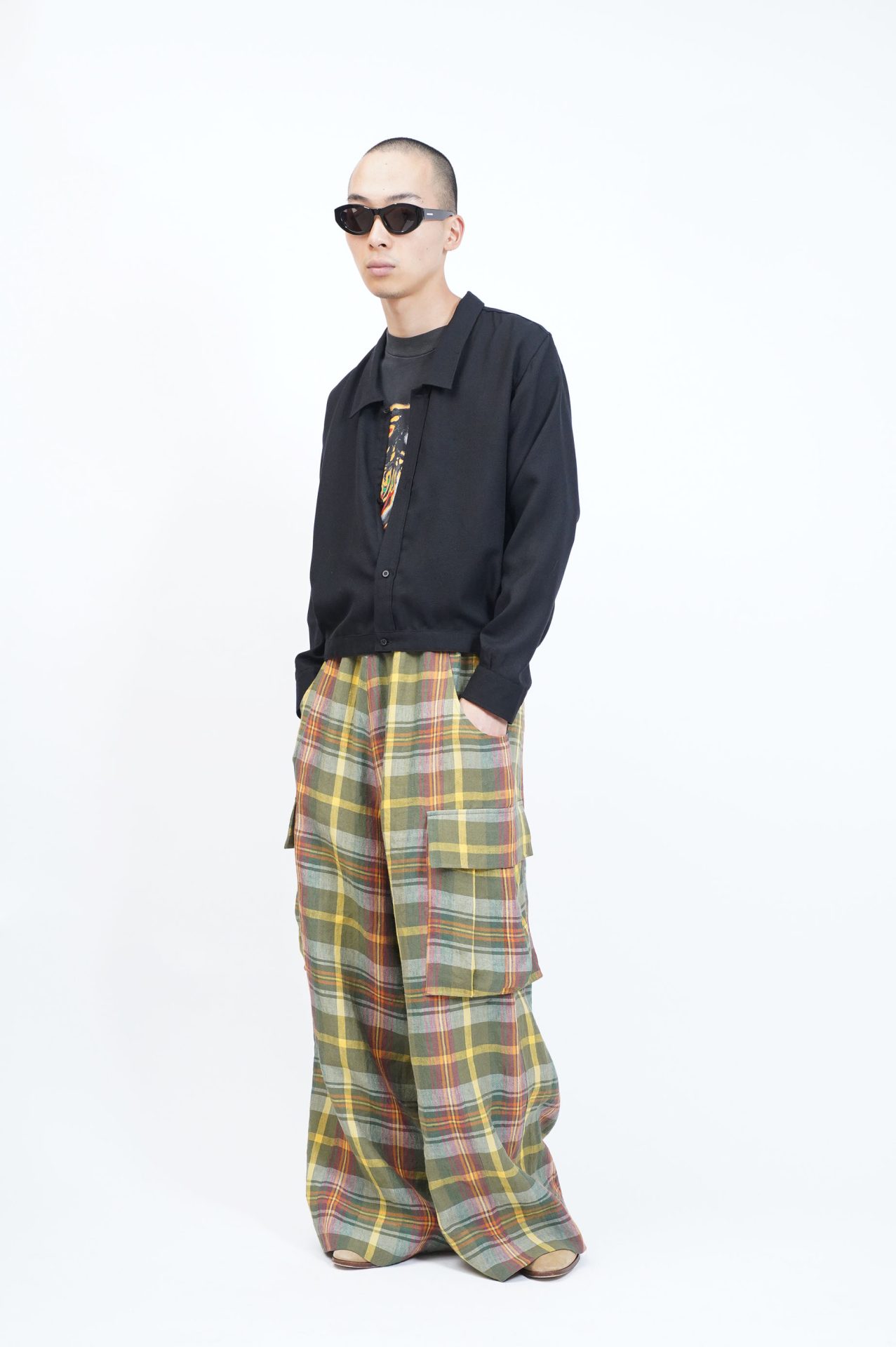PERIOD FEATURES といえばインド。インドの職人さんの手作業により生み出された幻想みたいなホントの刺繍。が通例だと思い浮かぶけどこのパンツはマシン刺繍(今しがた知りましたが)。パターンさえ決めればブレなそうなマシンで刺繍することを選んだのは、あえて、なのかそれとも成り行きでそうなったのか。というかそもそも多分生地自体の染めは見る限り手染めなんだろうな、ということはミックスか!ミックスか!マシンと職人のミックスか!ハハハ!ははは‥ 近くでよく見たら星じゃなくて花にも見えてきたな‥遠くから見たら花も星ってことか‥ 「サイケデリック菱形が散り染められた生地の上に、全面マシン刺繍が施されたタックドワイドイージーパンツ。」 「散り染め」ってなんなんだ‥あぁでももう桜も散ったしな‥ 第一印象そのまま、ビビッといいパンツですね!