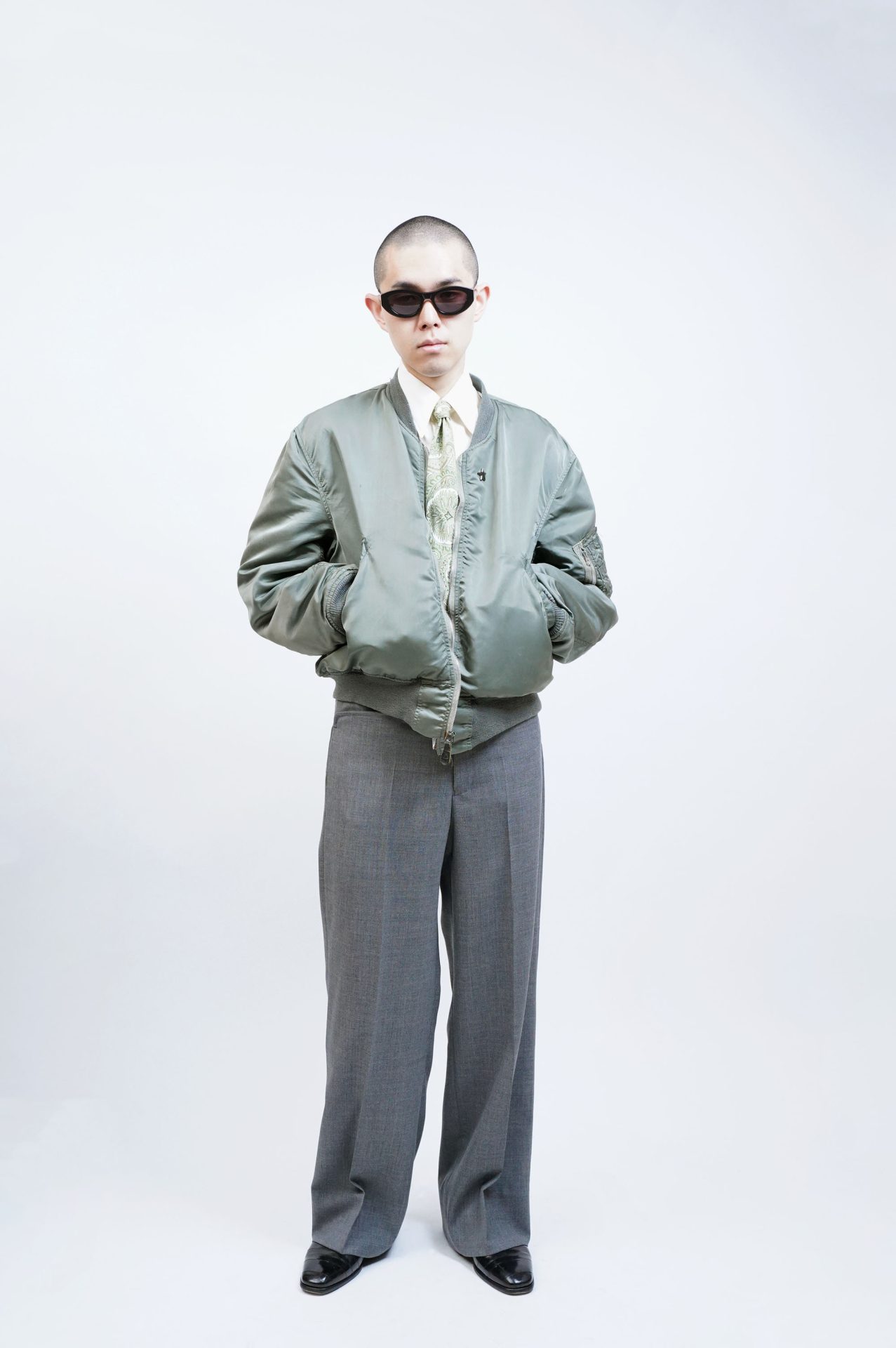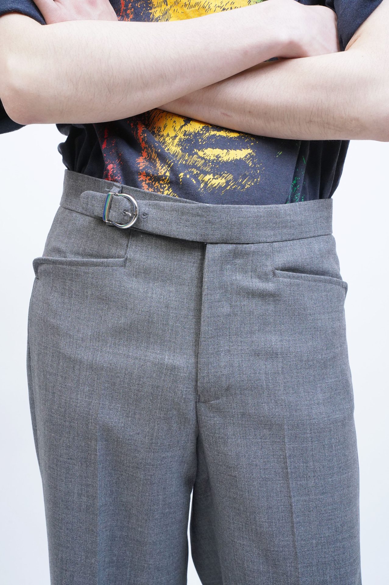 ワイドストレート、グレーのサマーウール、L-POCKETのカジュアルスラックス。 ベルトループレス。フロントにアジャストベルト。 おさらい完了! あとはコーディネート!というのがお決まりの流れですが、 グレーのワイドスラックスが合わせる服を選ばないことくらい百も承知‥ですよね‥ 逆に「こりゃ合わねえな!滑稽千万ここに極まれりィ!」な組み合わせを見つけるまでゴハン抜きよ!と言われたらきっとお腹と背中がくっついちゃってこのスラックスを穿いてもズルッと落ちちゃいました!なんて事態に陥りかねないので、まあ、ちょっといい感じに、少しやってみましょう。