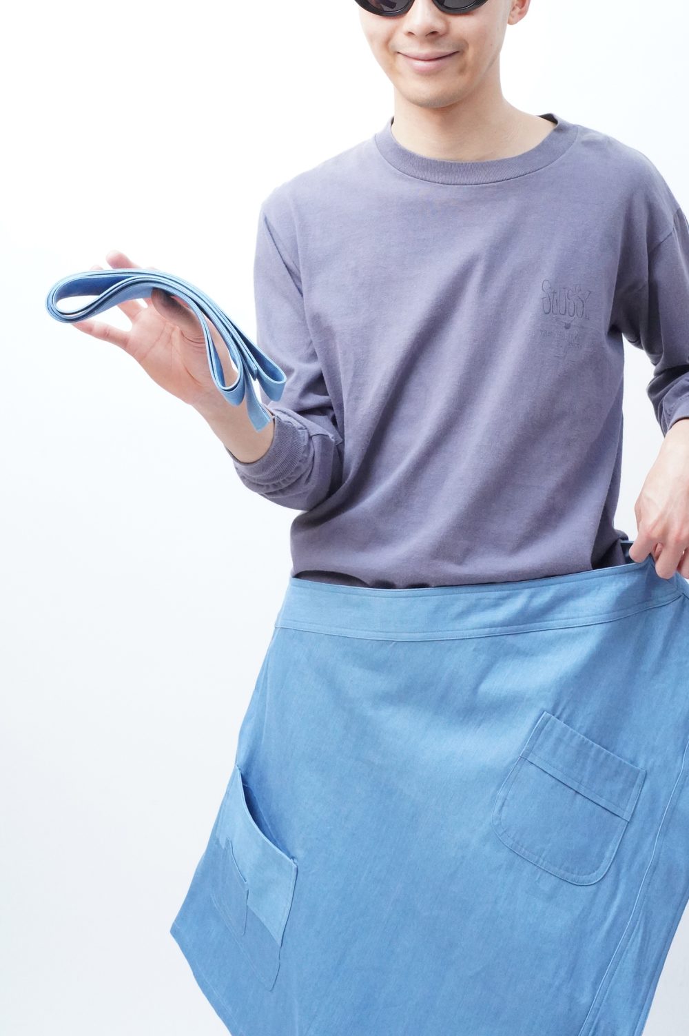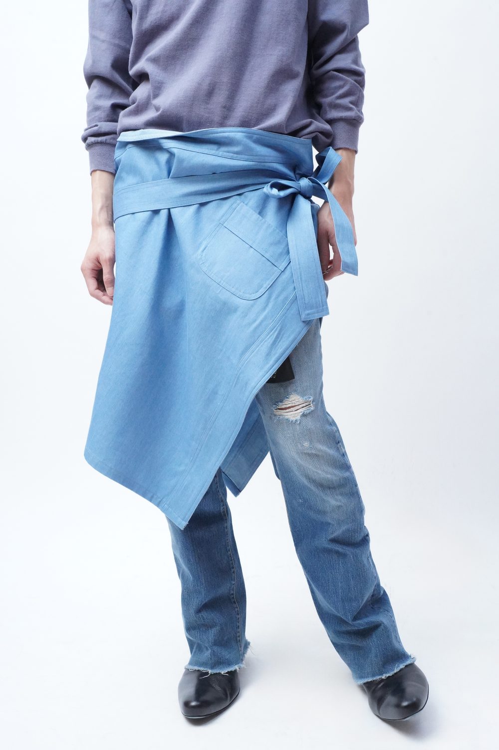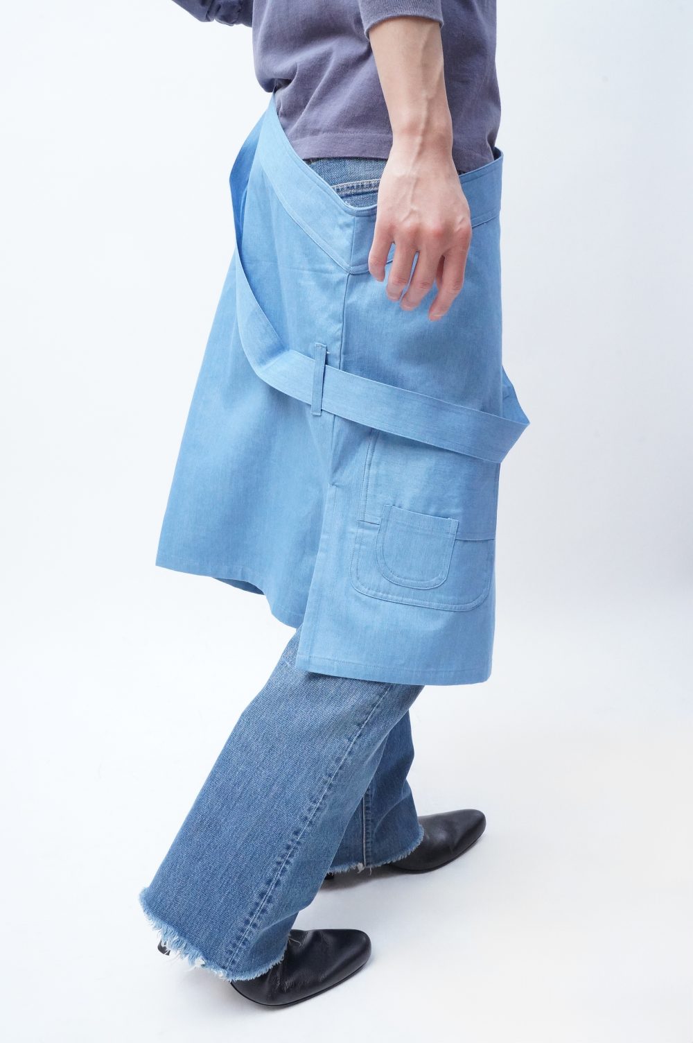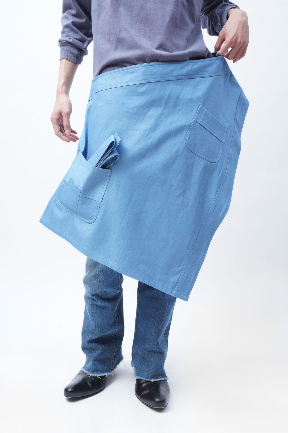 白々しく改まってナペロンまで遡りましたが、MANHOLE店内にはすでに幾度かエプロンが並んでいましたよね。「エプロン。」とだけ聞くと、実用的なイメージがあっ!という間にすぐに沸きましょうが、スカートを楽しんできた流れから少し逸れたつもりで巻いてみたり、さっきのようにワンショルダーベストとして着てみたりすると、そのプラグマティックな感じがグッドスパイスになるはずです。