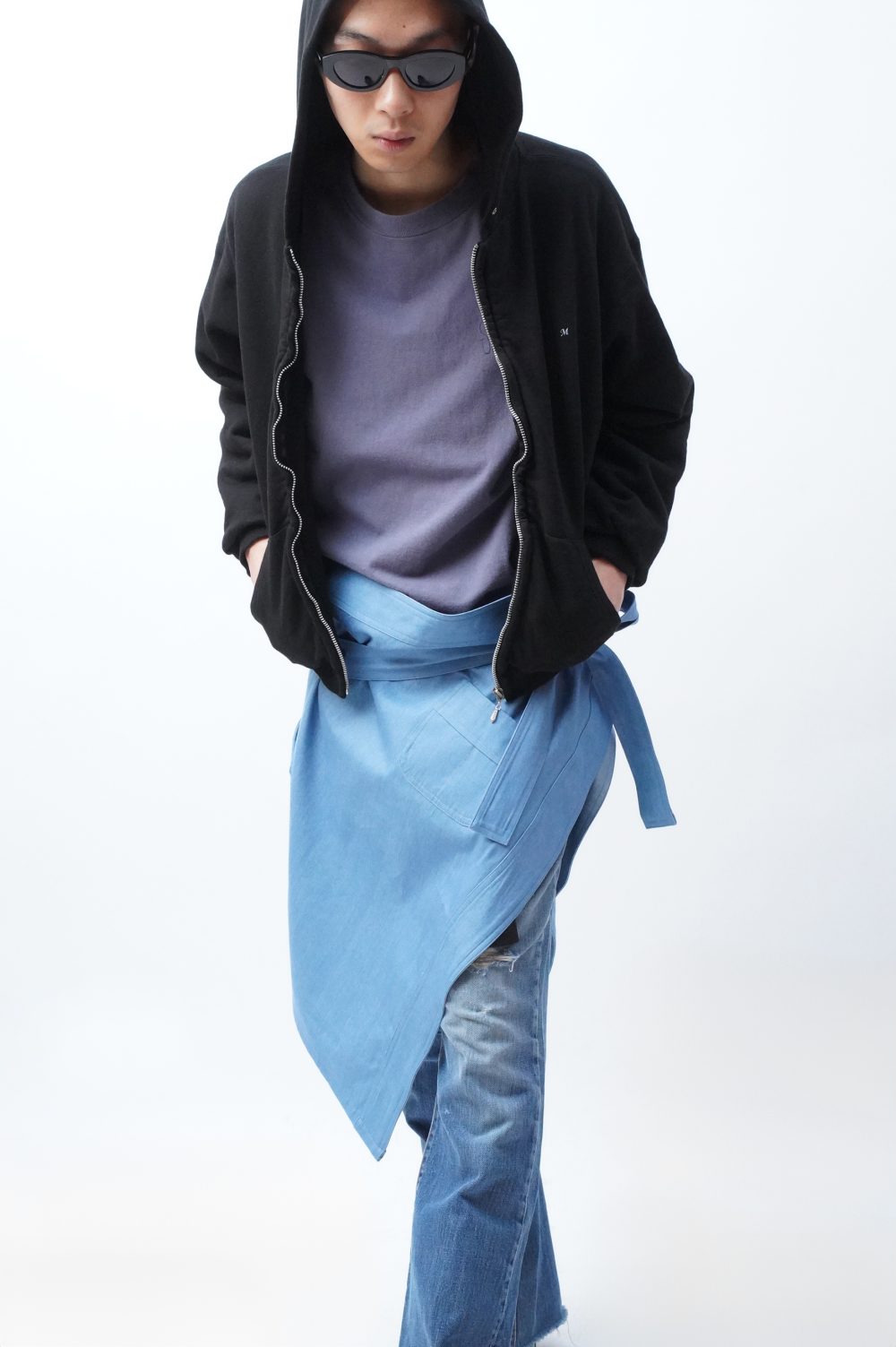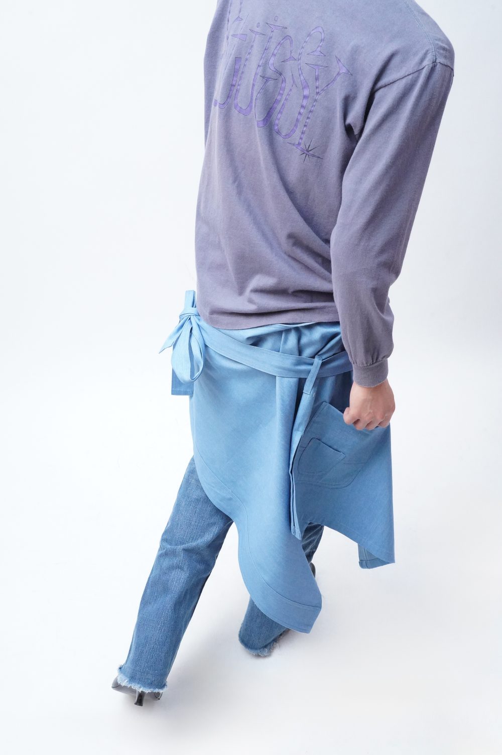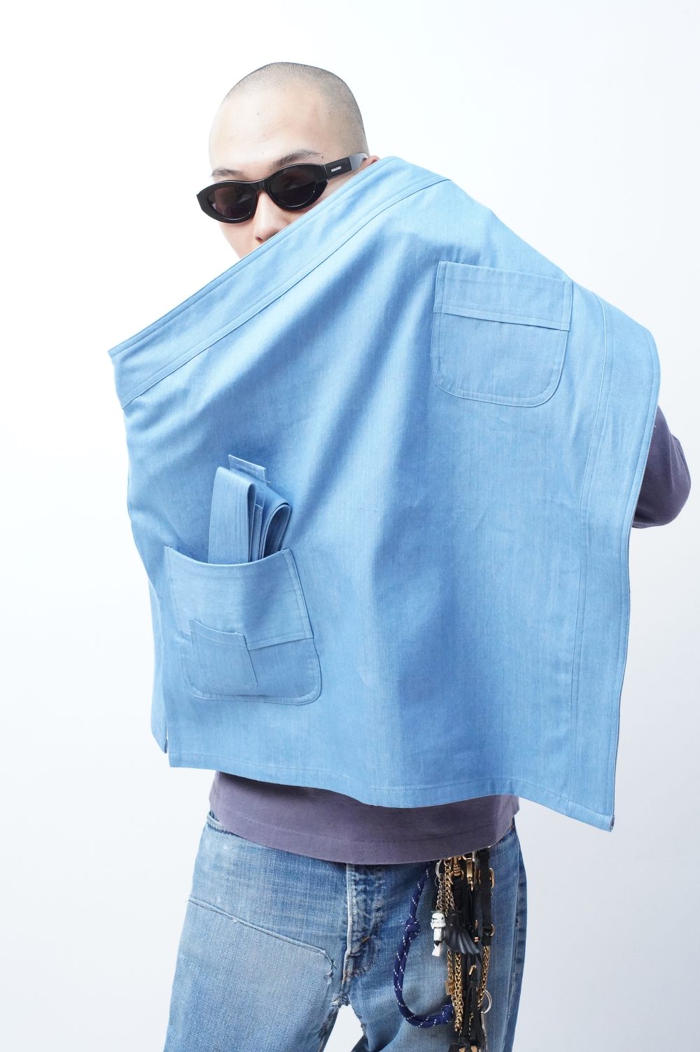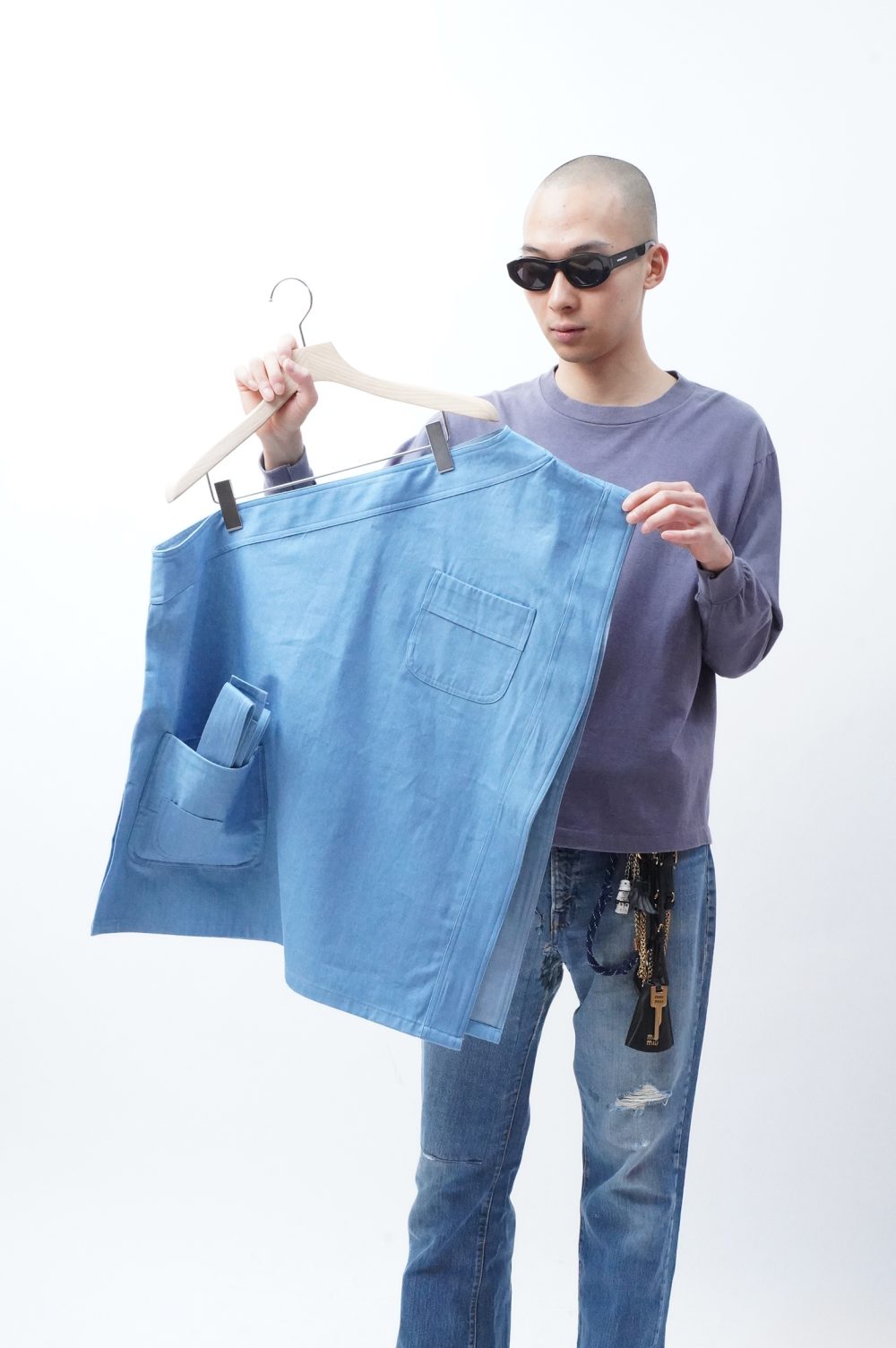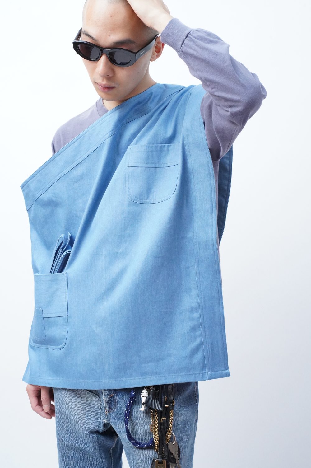 白々しく改まってナペロンまで遡りましたが、MANHOLE店内にはすでに幾度かエプロンが並んでいましたよね。「エプロン。」とだけ聞くと、実用的なイメージがあっ!という間にすぐに沸きましょうが、スカートを楽しんできた流れから少し逸れたつもりで巻いてみたり、さっきのようにワンショルダーベストとして着てみたりすると、そのプラグマティックな感じがグッドスパイスになるはずです。
