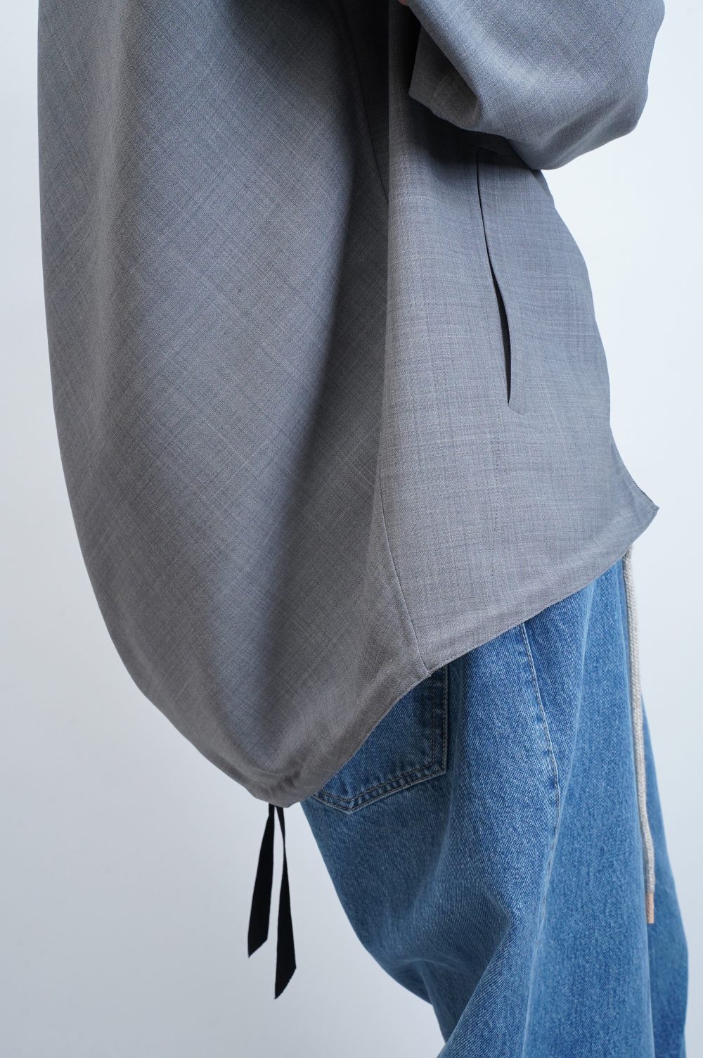前裾の両端にはドローコードが垂れ、後ろ裾にかけてラウンドしていくシルエット。そこへ、後身ごろの帯びた丸みが到着。 ※黒いリボンはデニムのものです。