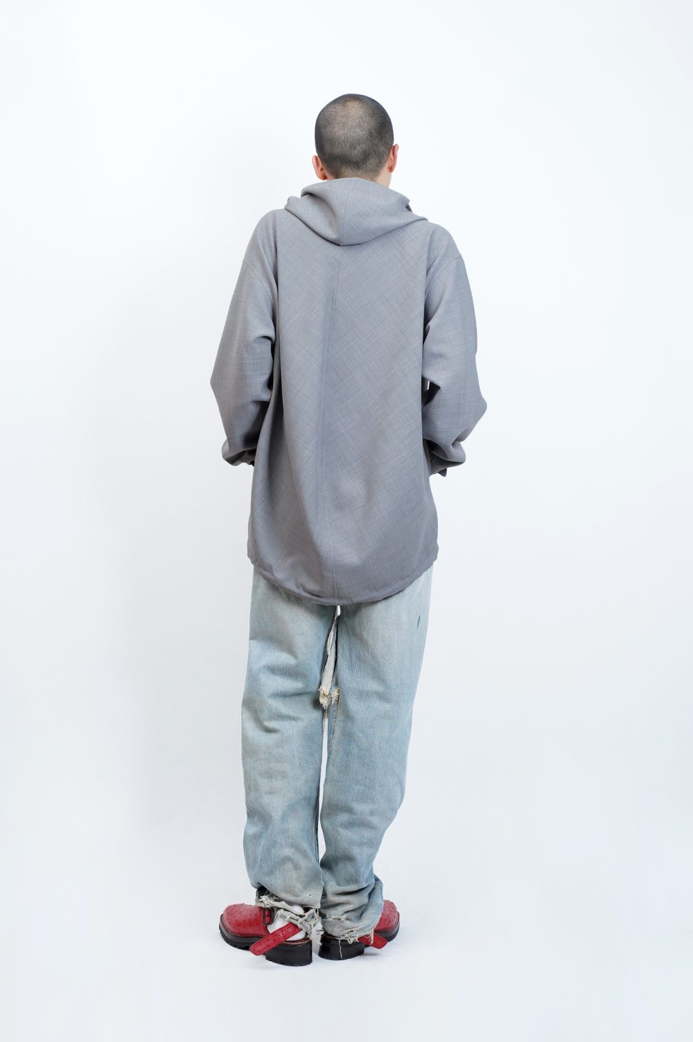 極細番手のサイロスパンポリエステル/ウール糸を平二重織で製織した生地で仕立てたジップアップフーディ。1960年代〜1970年代のスポーツスウェットフーディーをリファレンスとし、ドレスやクチュールや90年代ストリートカルチャー要素を積極的に取り入れたアプローチで製作。二重織による適度なふくらみと縦横にしなやかに伸びる2WAY特性が、快適な着用感と美しいシルエットを両立させています。縫製は毛抜き合わせによるリバー仕立てで表裏ともにクリーンな仕上がりを実現。スポーツ・ドレス・ストリートが共存する独特な仕上がりとなっています。 (NICENESS Official Websiteより引用 )