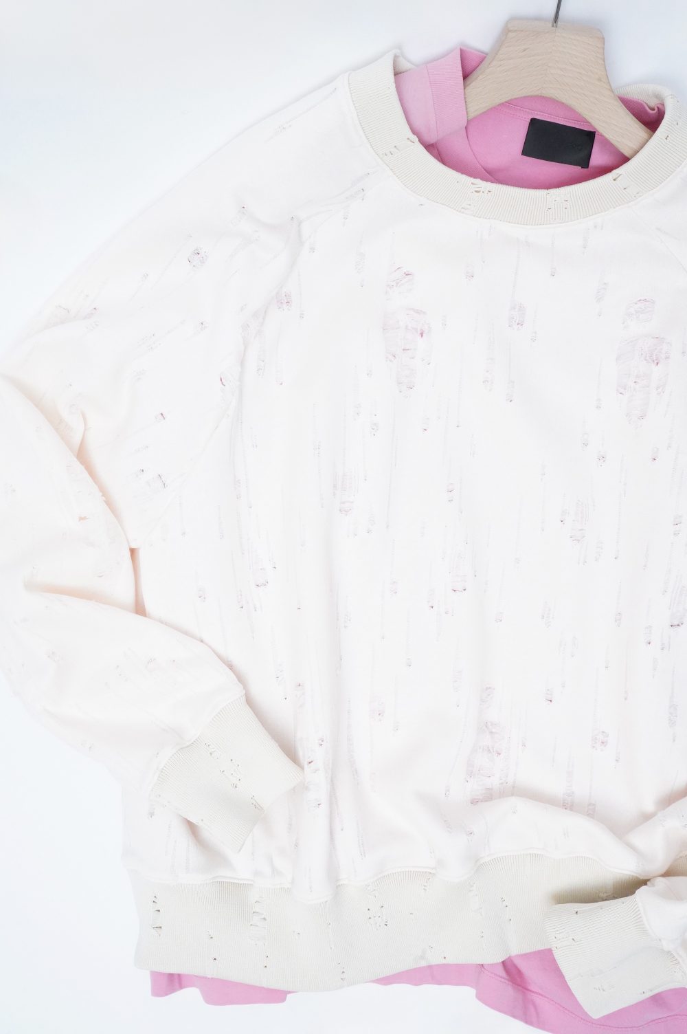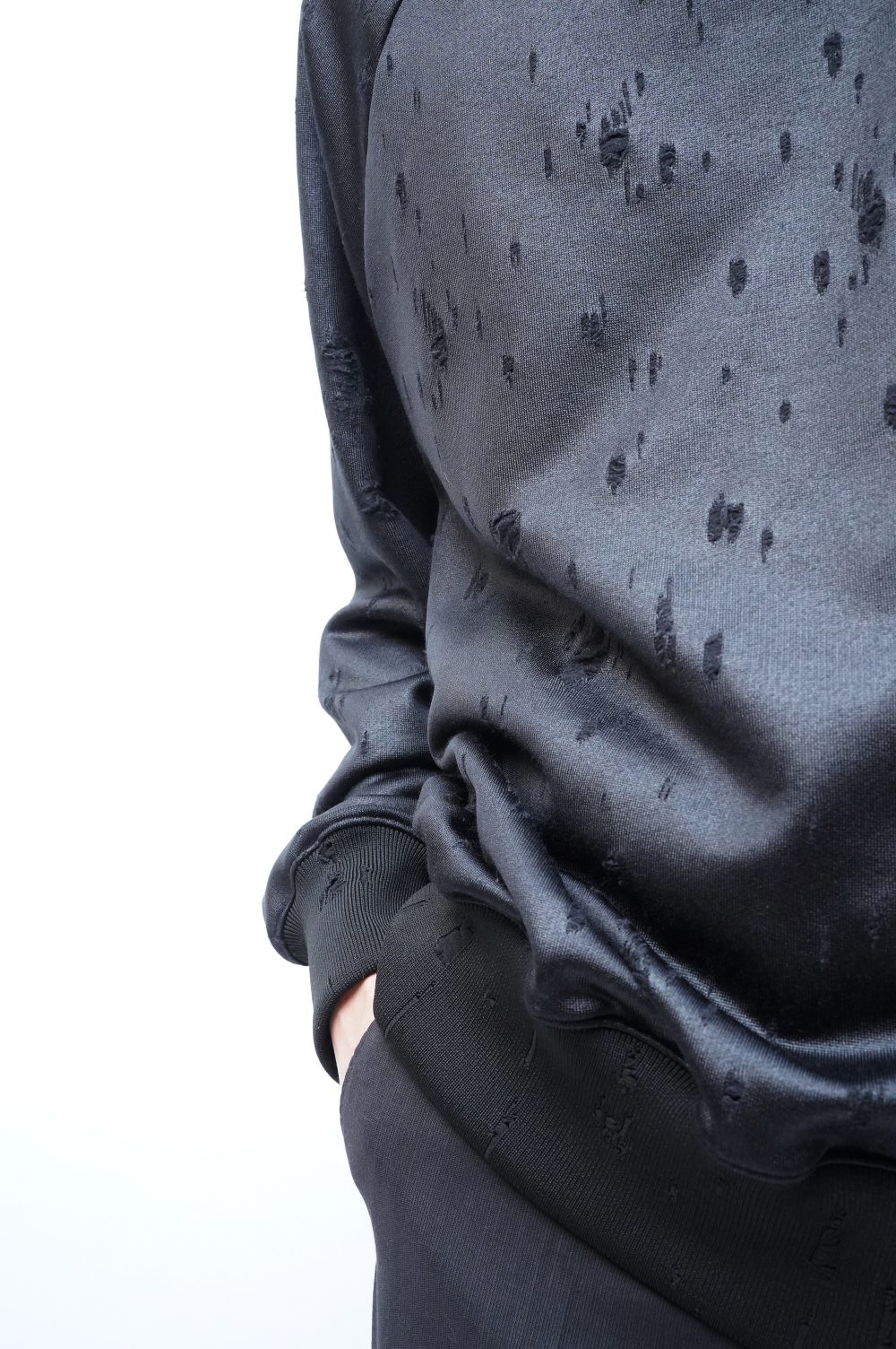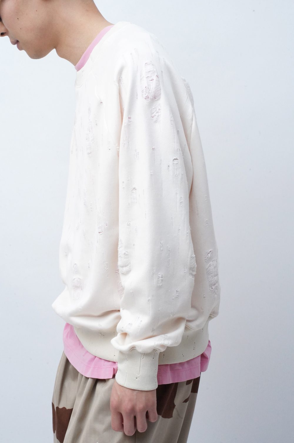 はじめこのスウェットを目にしたとき、「スゲーぼろぼろだ!」という謎の感動と共に「どうやってやってんだろ?」という疑問がプカン。ふだん洋服の製法などに疎い(オイ)オラ、河上さんに綺麗に補完してもらえるとはいえ流石に気になりますよね。だって、ボロボロとはいえ少し見てみると単に破いたとか引っかいたとかいうんじゃないことだけは何となく分かる、けどじゃあ何なんですか!というわけで柄にもなく調べてみることに。