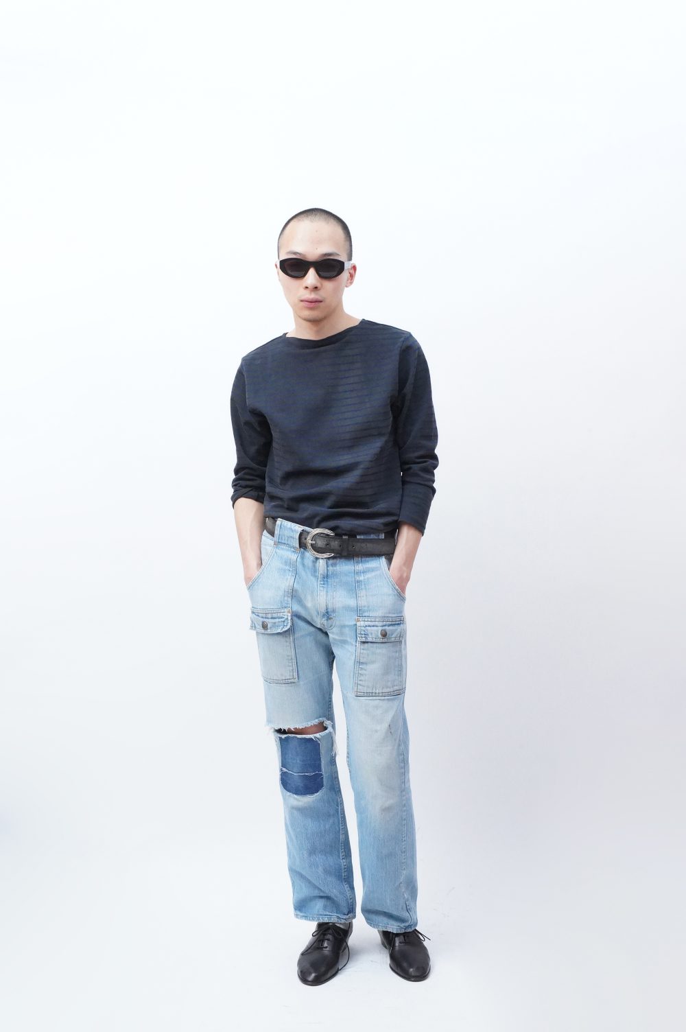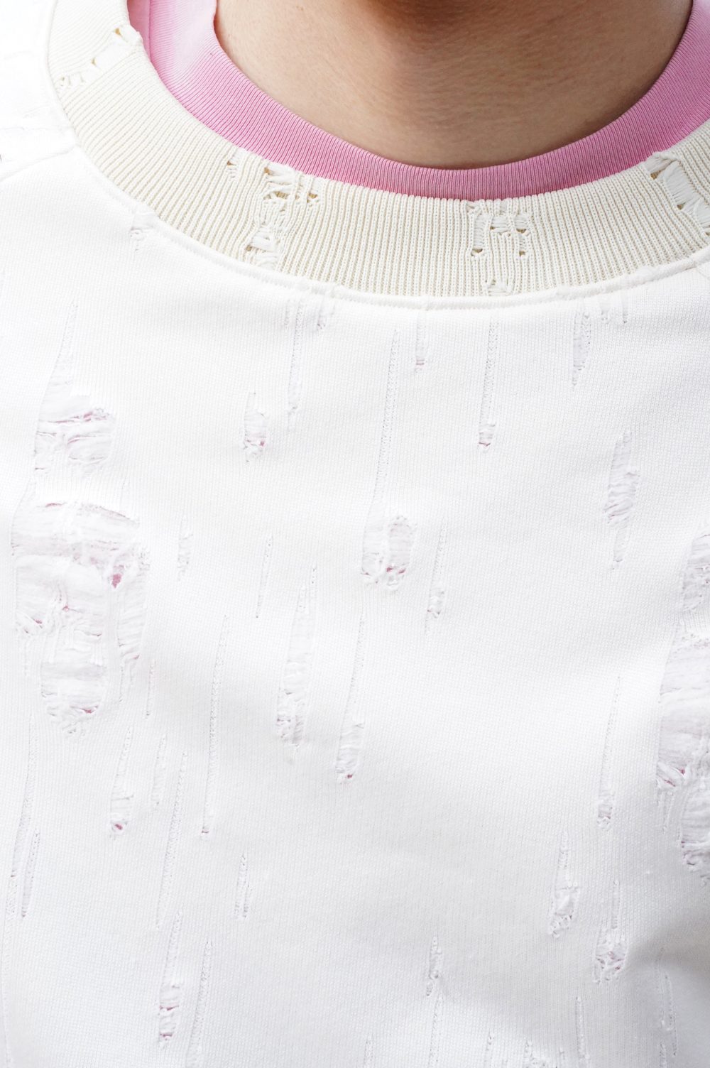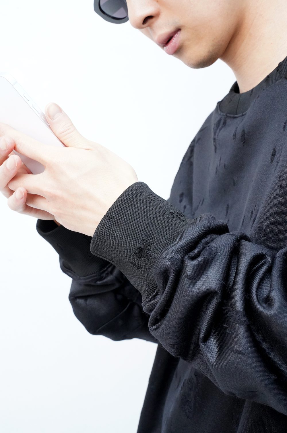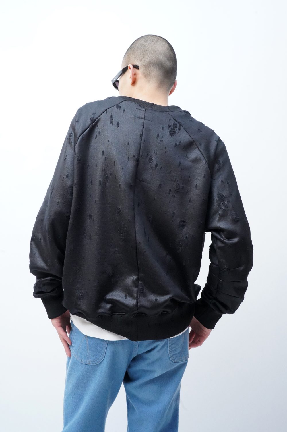 はじめこのスウェットを目にしたとき、「スゲーぼろぼろだ!」という謎の感動と共に「どうやってやってんだろ?」という疑問がプカン。ふだん洋服の製法などに疎い(オイ)オラ、河上さんに綺麗に補完してもらえるとはいえ流石に気になりますよね。だって、ボロボロとはいえ少し見てみると単に破いたとか引っかいたとかいうんじゃないことだけは何となく分かる、けどじゃあ何なんですか!というわけで柄にもなく調べてみることに。