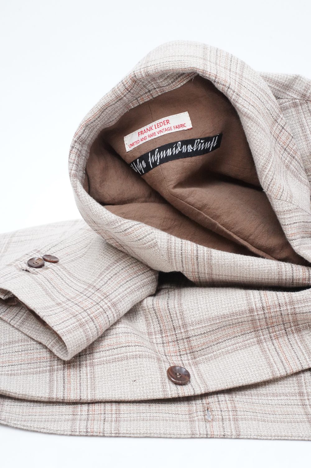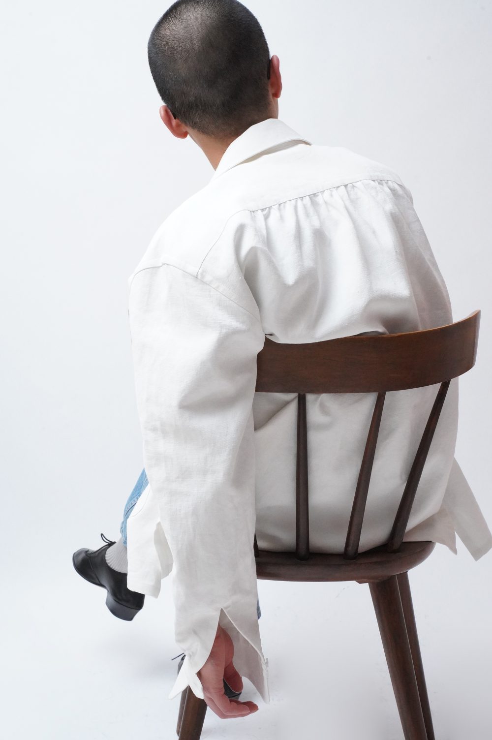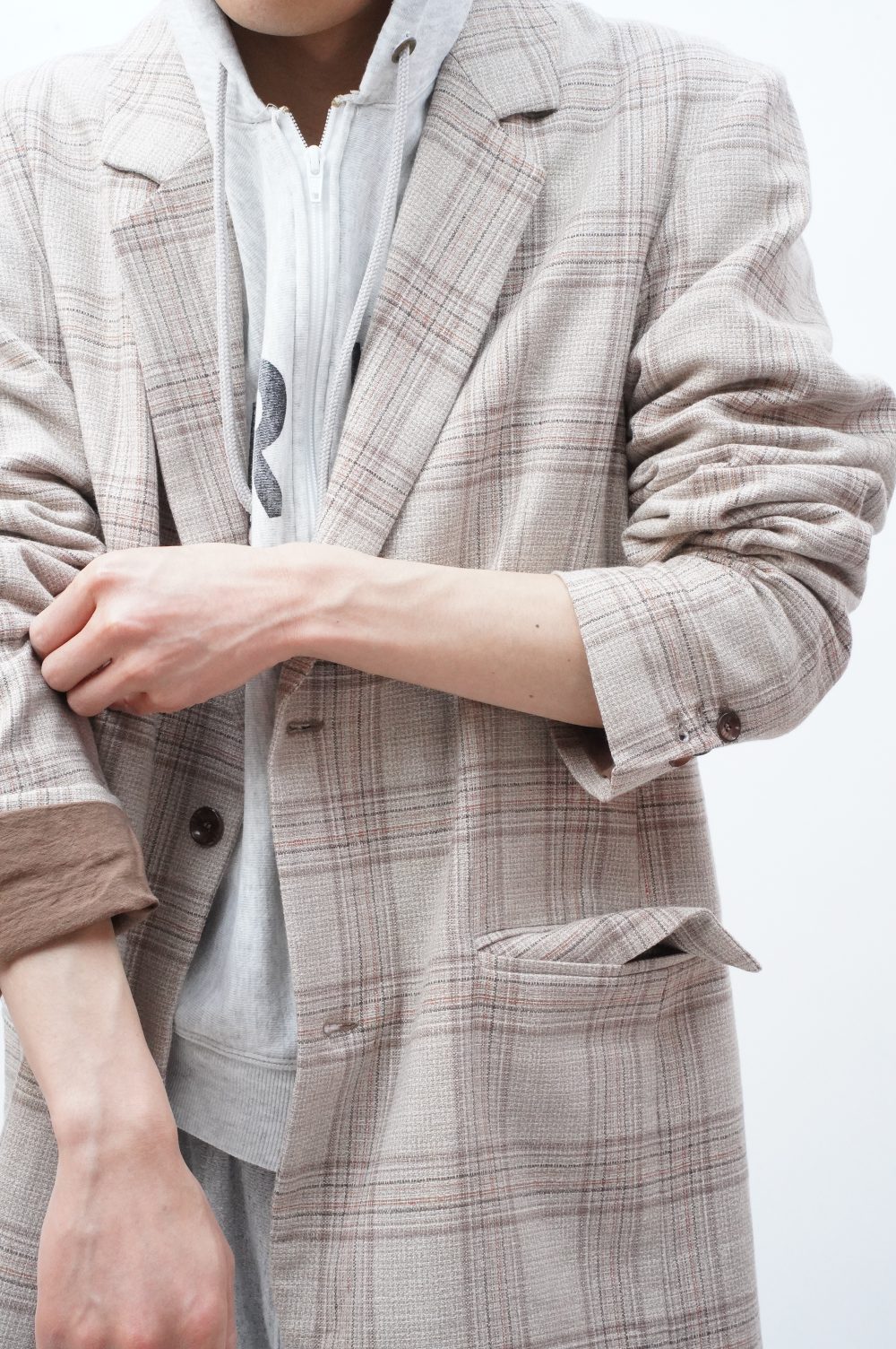 リネン80%、コットン20%のデッドストック生地を使用した2つ釦のテーラードジャケット。