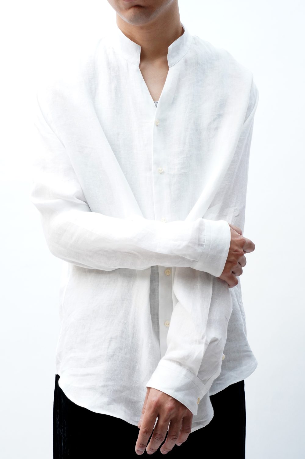 このFIGARET PARISのシャツ:Carlもそんな感じ。スタンドカラーの開襟リネンシャツ。