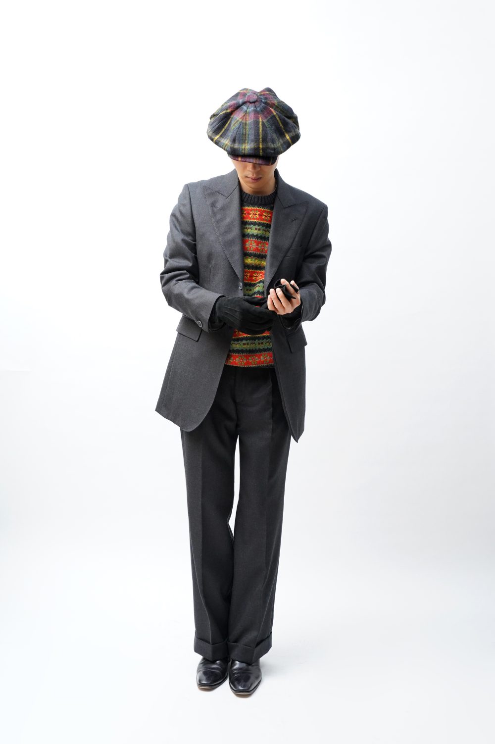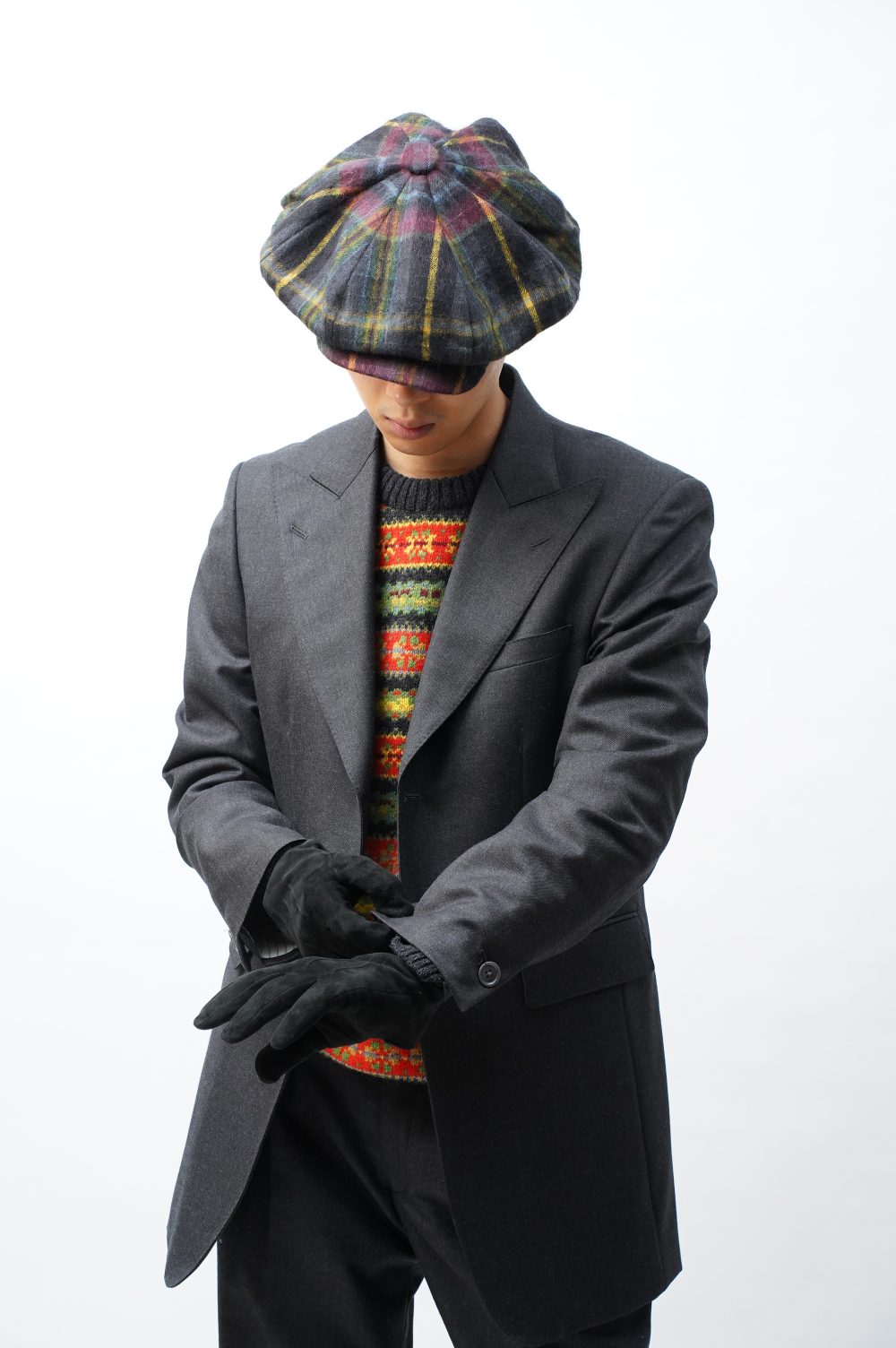 黒をベースにダンカンコノヤロー、じゃなくて、暖寒色々が縦横無尽にチェックしているこのナイトタータンが今シーズンのNICHOLAS DALEYにおいて象徴的かつ魅力的。このことはぼくたちにとっては言わずもがな、もはやお読みの皆さんにとっても聞かずもがな、そろそろ耳にタコができてしまうのではないかと心配さえしております。奇しくもナイトタータン一見さんのあなたさまも心配無用。誰がお断りするものですか。というか、何を知ろうが知るまいが関係なし、強靭な色の組み合わせがニコラスチェックの魔力のようなものなので、是非とも伝わってきたそのパワーをストレートに信じていただきたい。