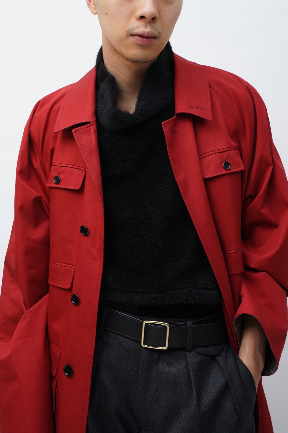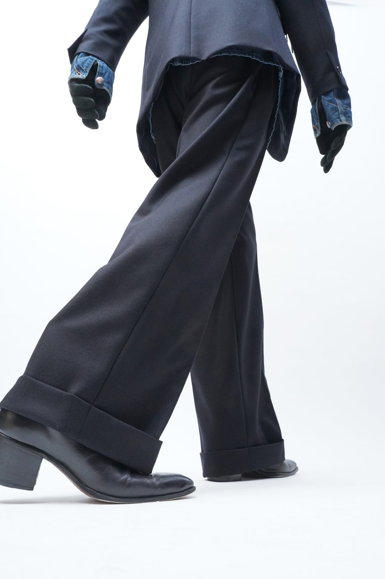 「高いボタン位置、ズレたウェストシェイプ、renomaのシグネチャーである両サイドのフラップ付きのコインポケット」に見られる、このJ.L SINGLE PEAKEDとPattes d’éléphantの特徴的なバランスやディテールを差し置いても、礼服のフォーマットで仕立てた日常着だ。