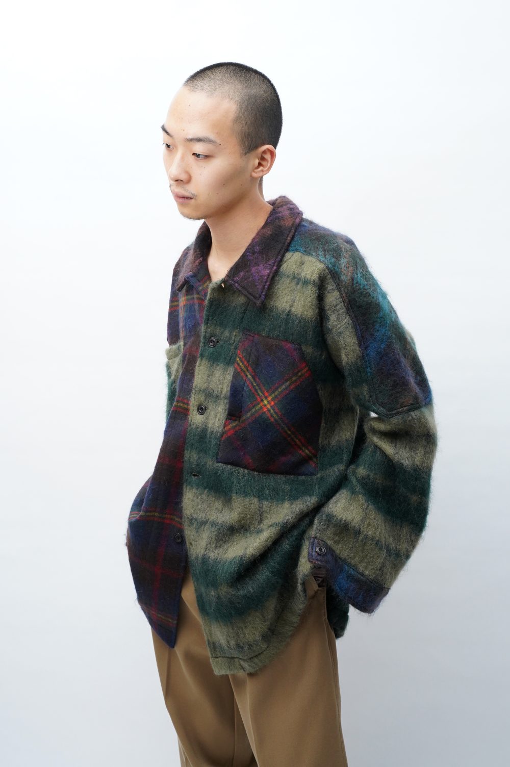生地はデザイナーが数年にわたりロキャロン社に別注をかけてきたウールモヘアのタータンチェック。「NICHOLAS DALEY自身が格好がいいと思う配色、質感」を形にしたシグネチャータータン。