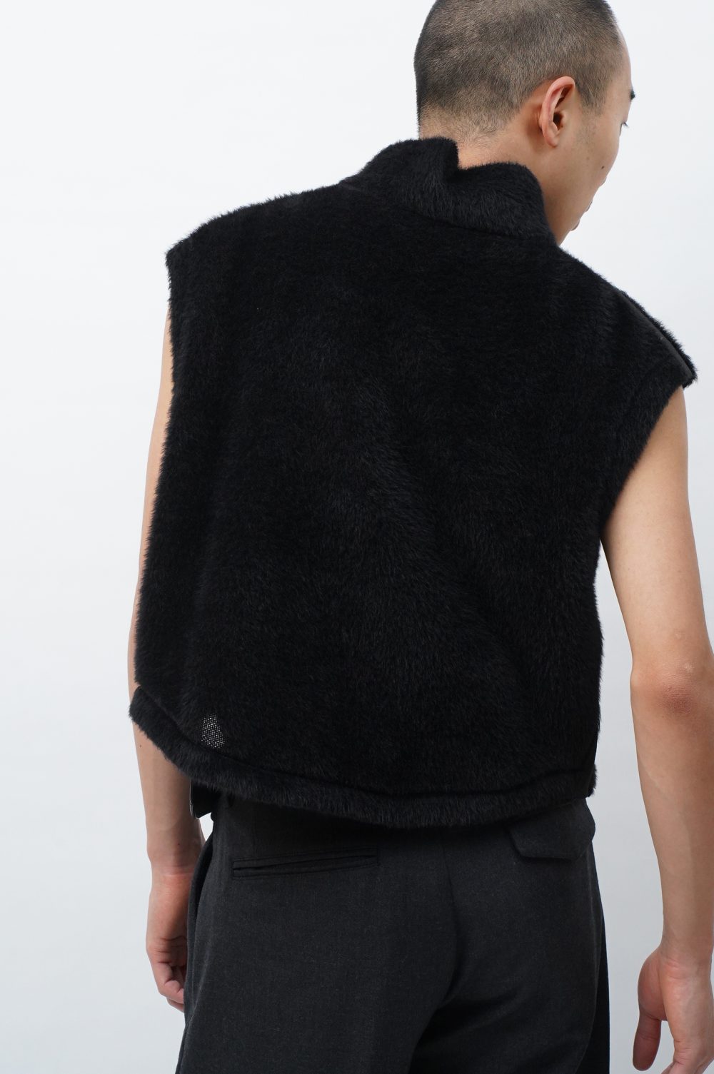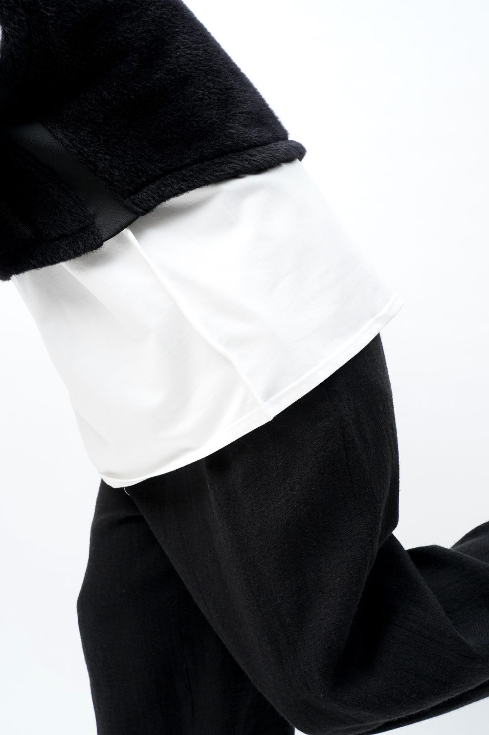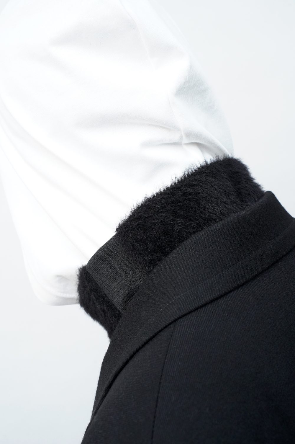 フワフワじゃないところ、つまり首元から脇腹の部分は伸縮性抜群のニットテープになっています。着脱に直接関わるパーツ。気持ちよく被れます。機能性のみを求めてこれを採用したわけではないことは、このテックみのある生地の幅が、ファーの持つ柔らかなムードをいかに絶妙な塩梅で引きしめているかをご覧に入れるだけで十分でしょう。グラデーションやコントラストとも異なる、唐突な凹凸。