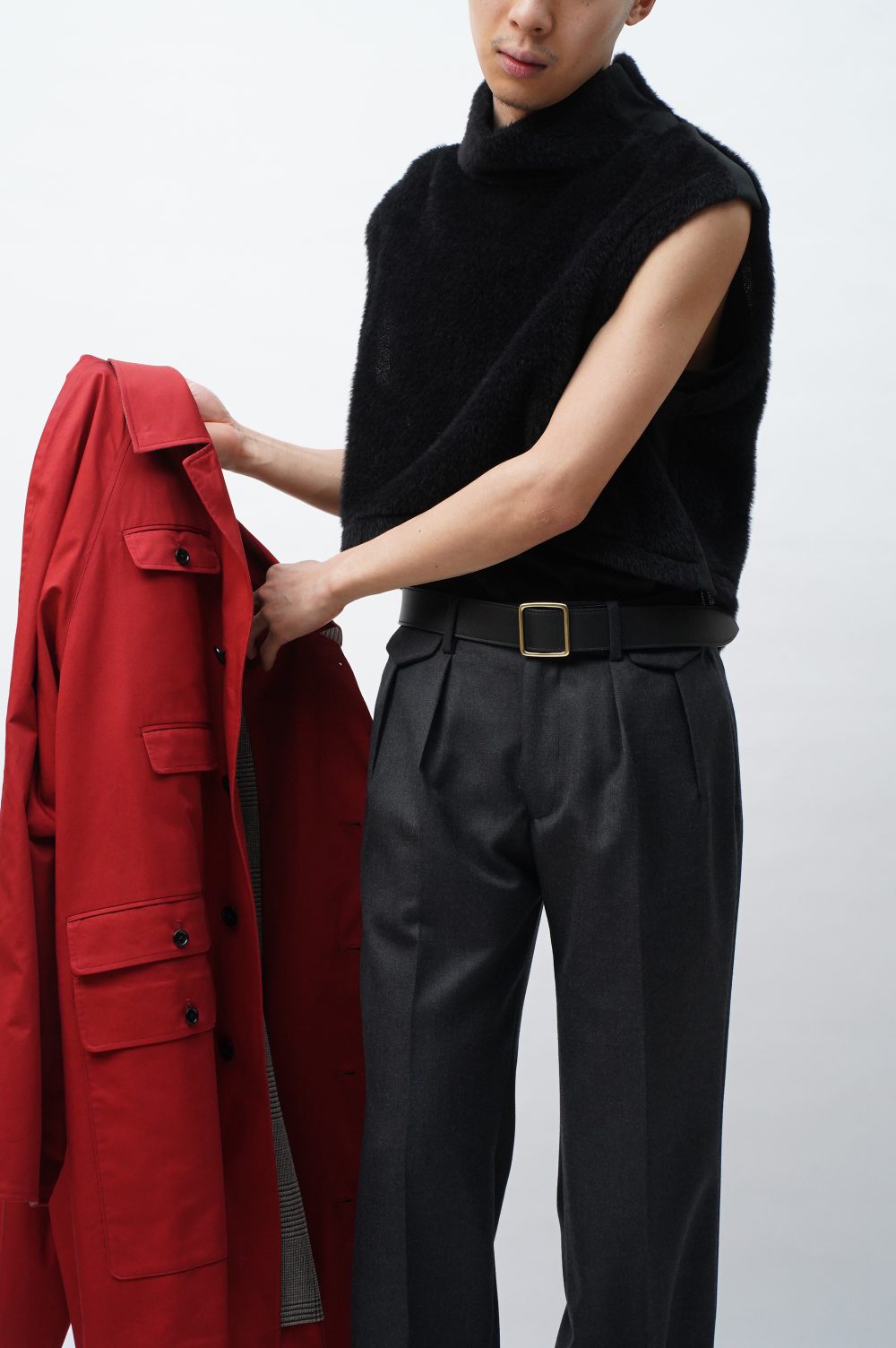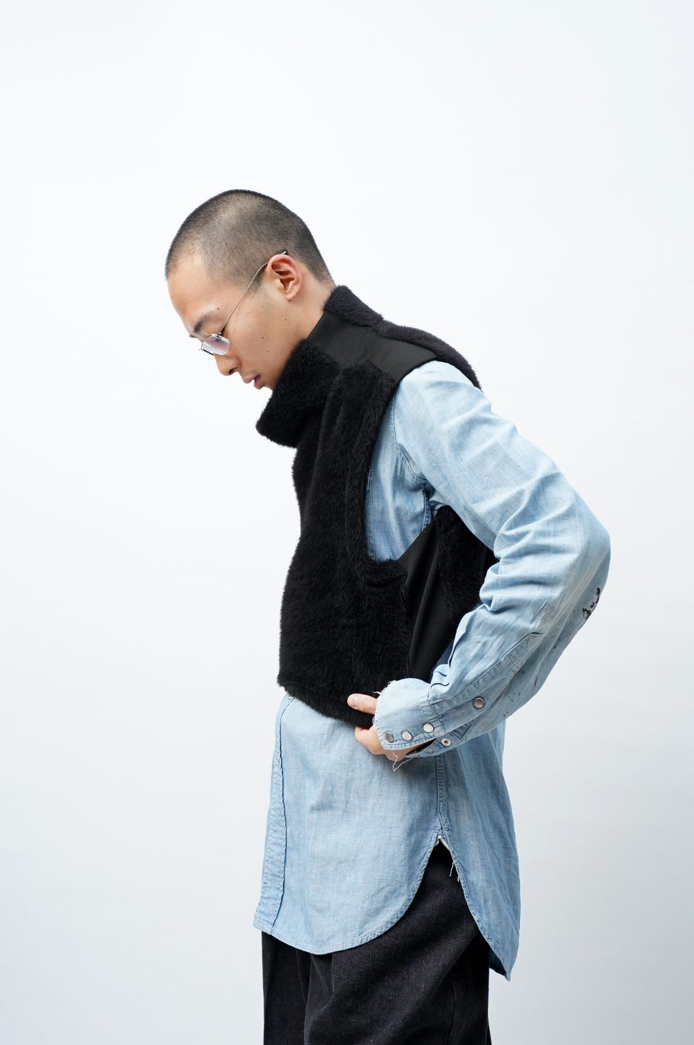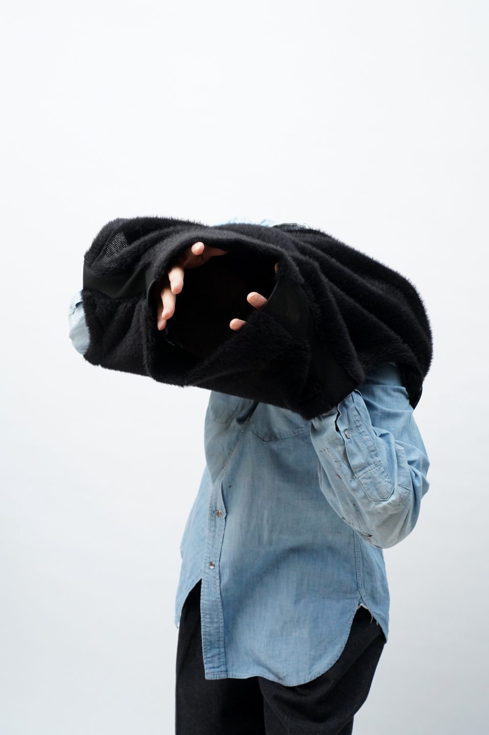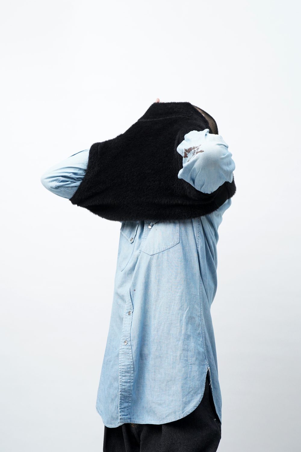 フワフワじゃないところ、つまり首元から脇腹の部分は伸縮性抜群のニットテープになっています。着脱に直接関わるパーツ。気持ちよく被れます。機能性のみを求めてこれを採用したわけではないことは、このテックみのある生地の幅が、ファーの持つ柔らかなムードをいかに絶妙な塩梅で引きしめているかをご覧に入れるだけで十分でしょう。グラデーションやコントラストとも異なる、唐突な凹凸。