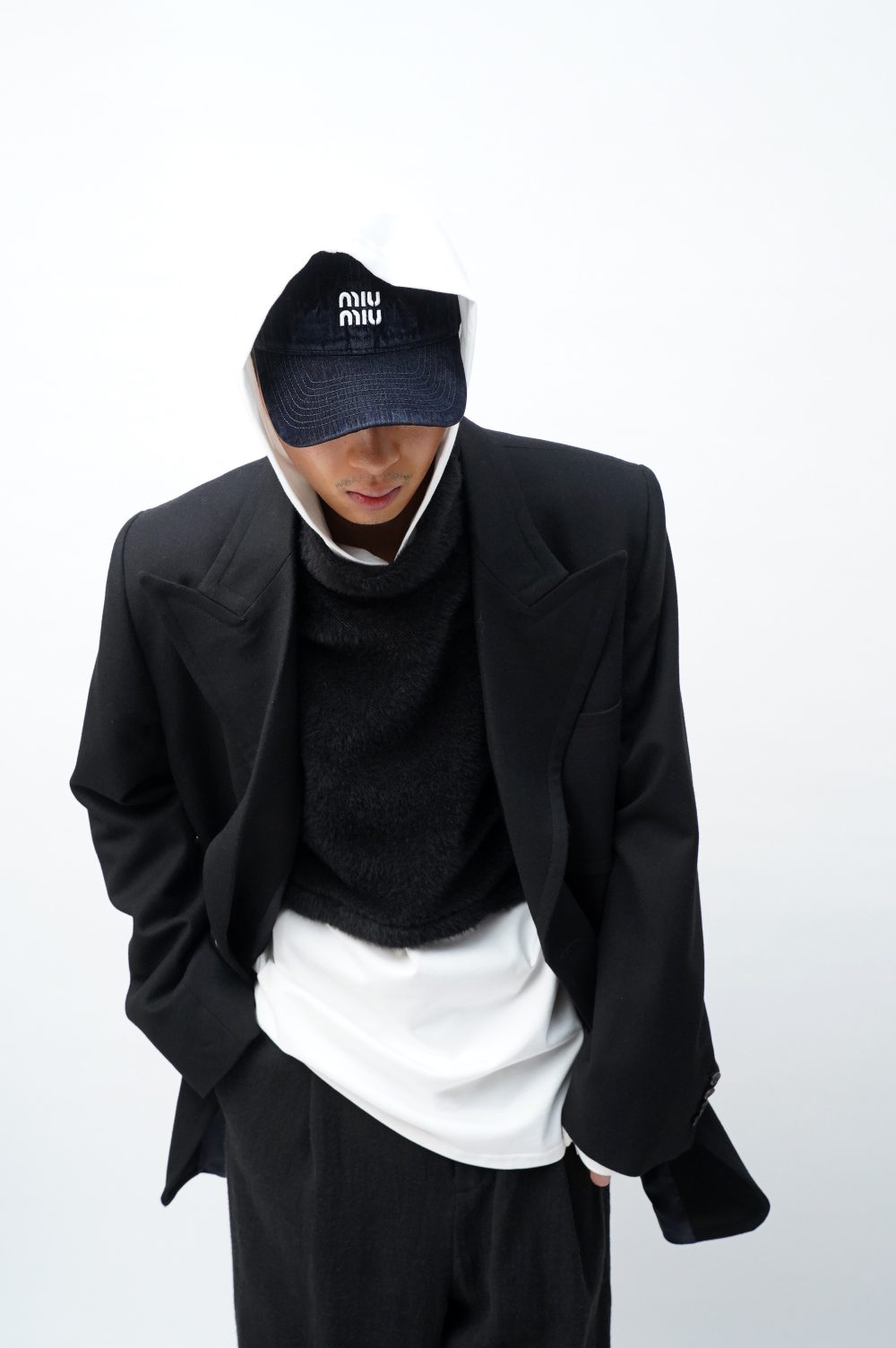 ミッドナイトブルー、ノーベントのシングルピークドといったタキシード、及びディナージャケットの正礼装に近い仕様ながら生地はウーステッドではなくスポーティなフランネル、ナット釦、そしてパンツにはベルトループが付き2つのプリーツが入りバックポケットも両サイドに入り、W仕上げかつその巾は5cm。