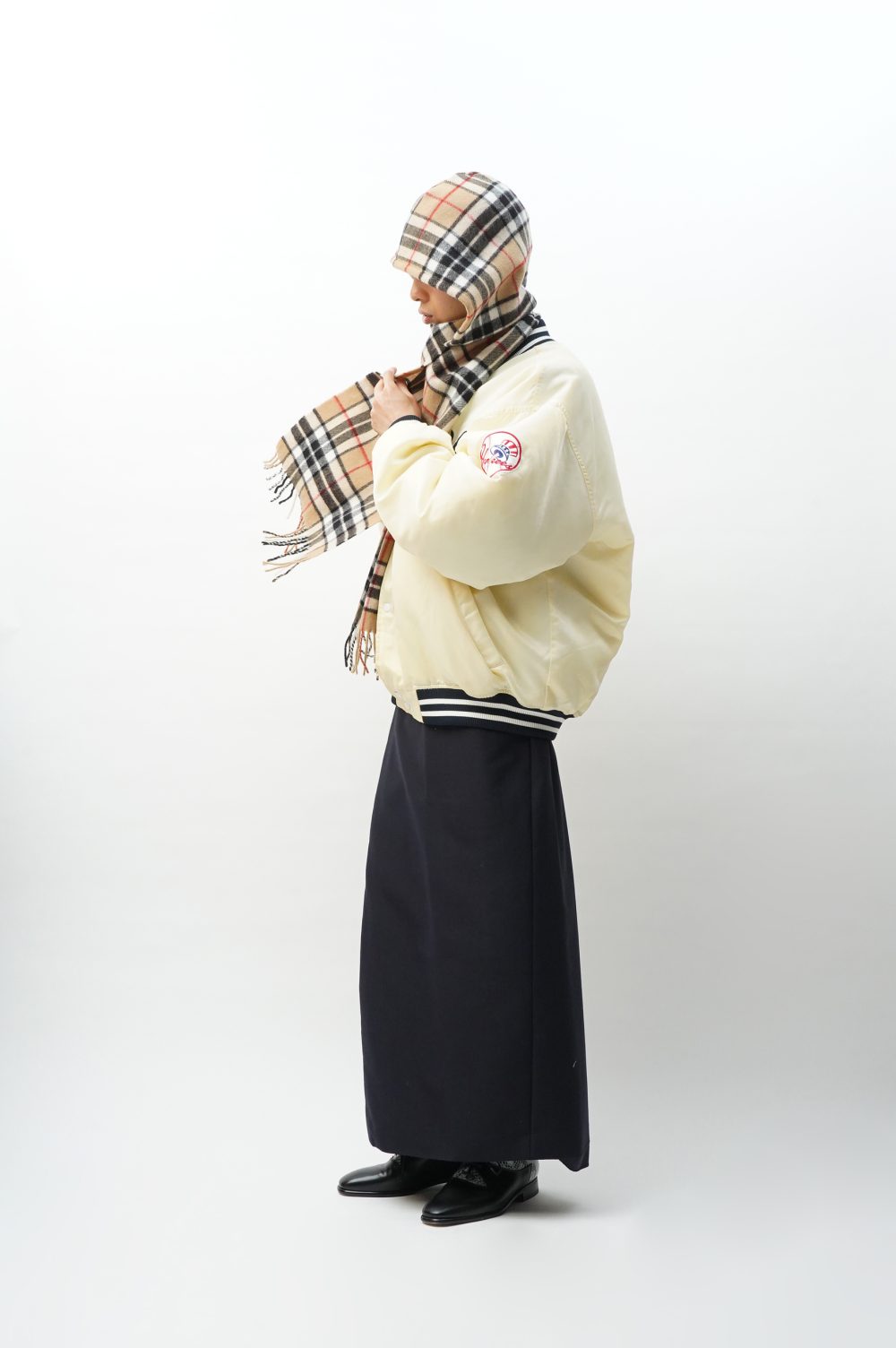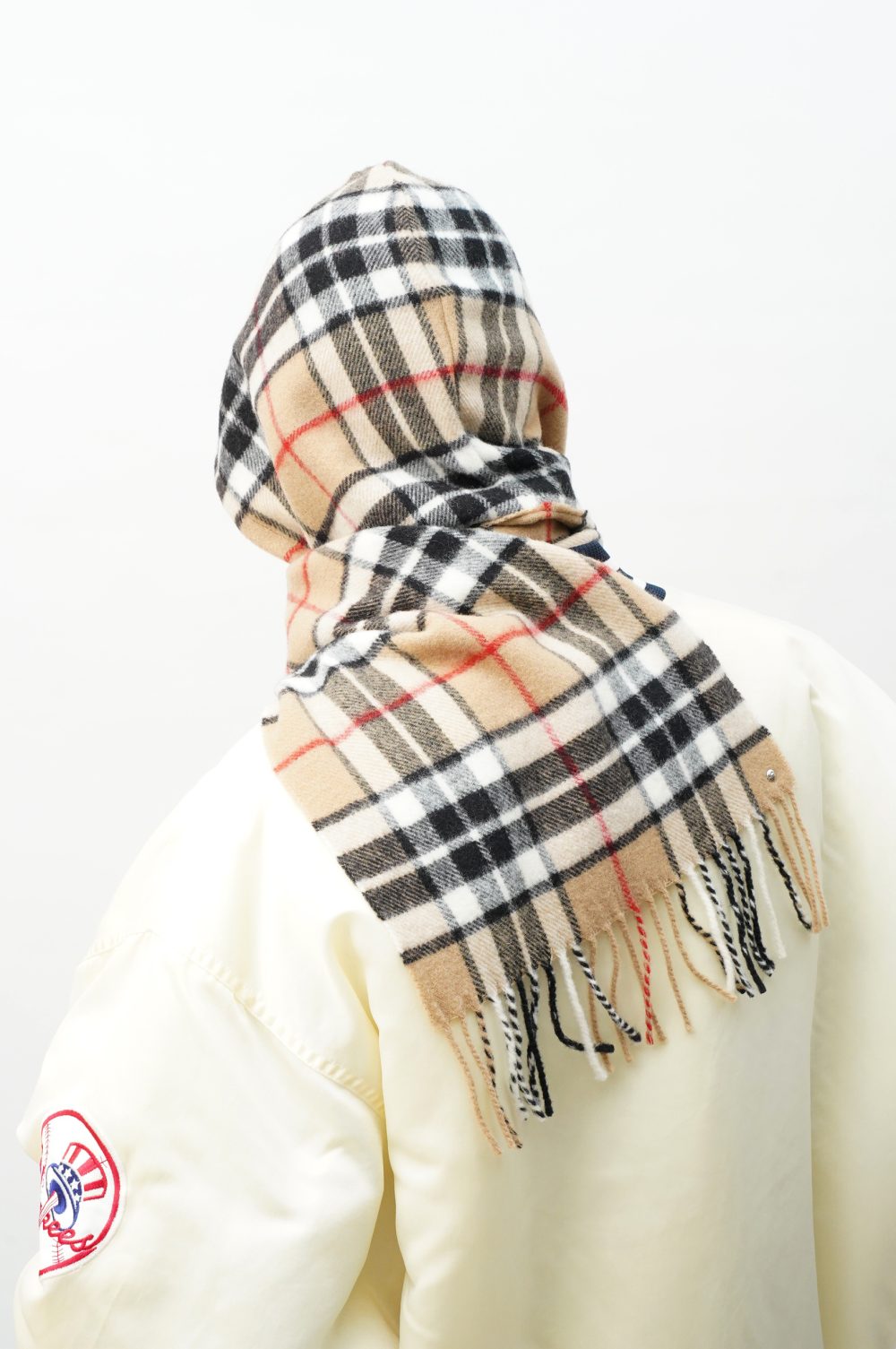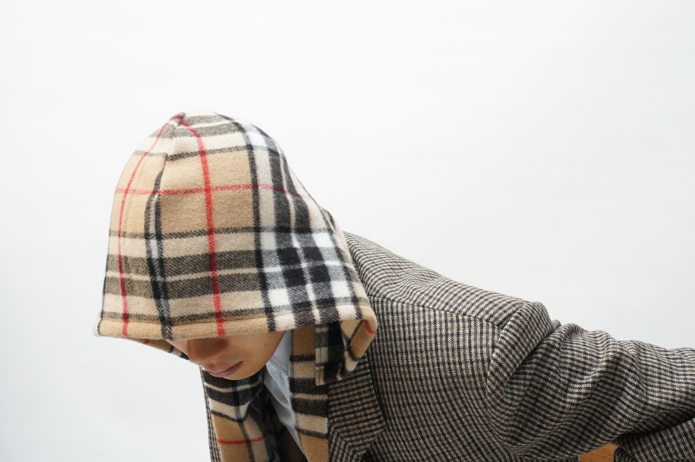かなり多くの人が「あれはマフラーだな」と認識するであろうこのチェック。 しかしこの膨らみ、フォルムはまさにフード。 はい。 フードでありマフラー(スカーフ)でもある、というのがどう考えても答えなのですが、それでおしまいならば既にモデル名でチェックメイトなのでまだ少し徒に歩を進めようと思います。