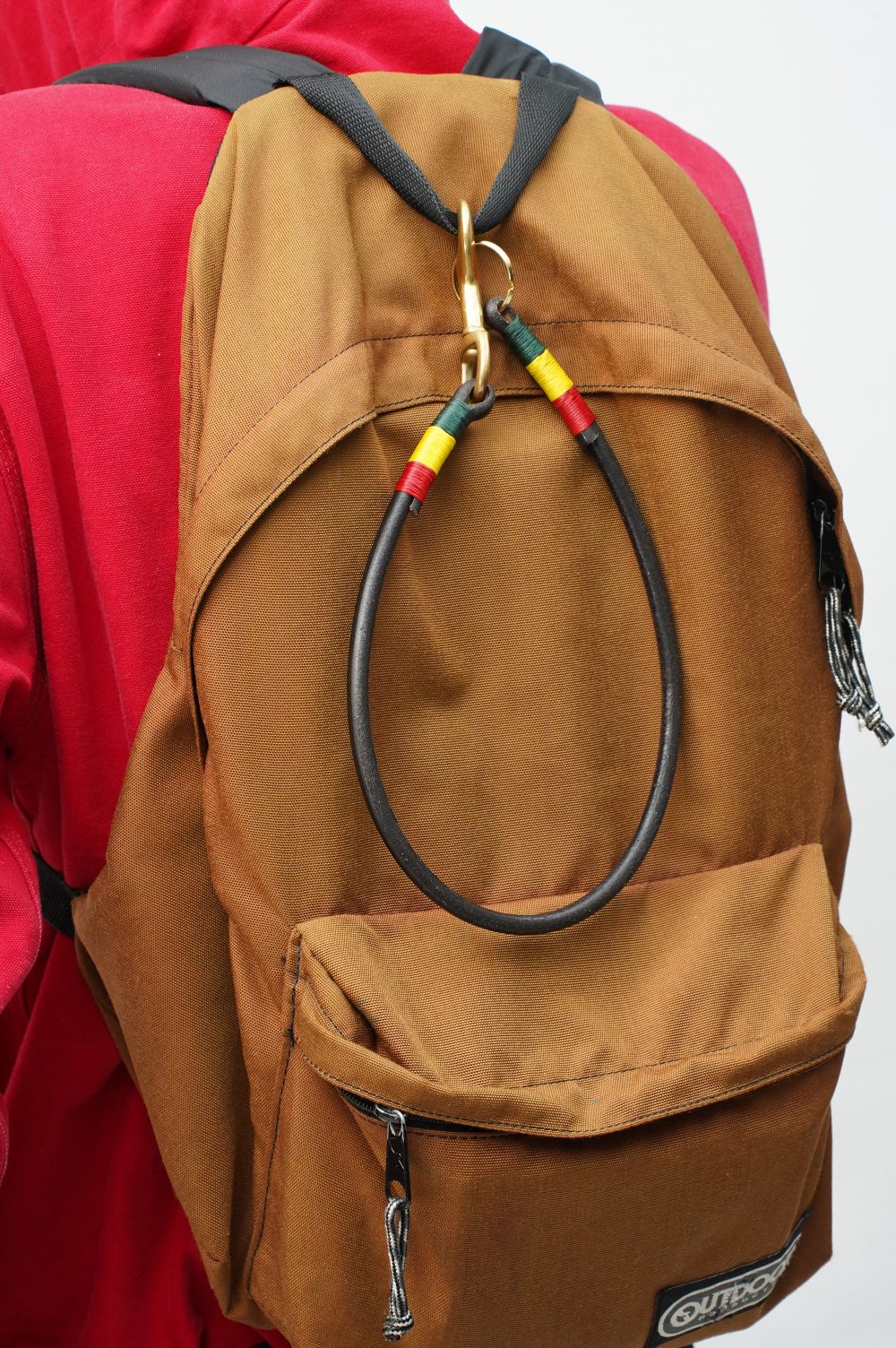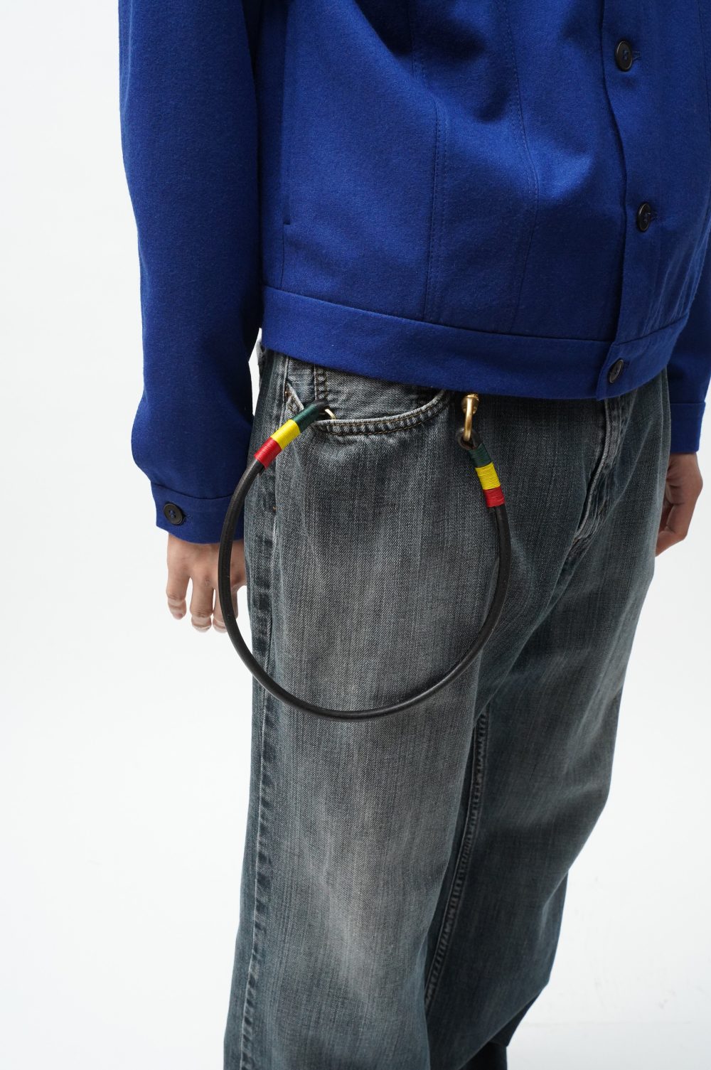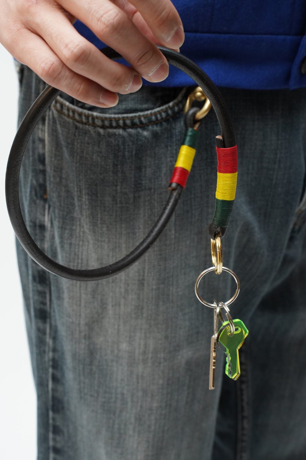 Kingsley Walters Studio、LANYARD T1。 8mm幅のレザーコードを使用し、トリガーフックとスプリットリングを備え、両端にはKWSのジャマイカン・ヘリテージ・カラーズが配されています。