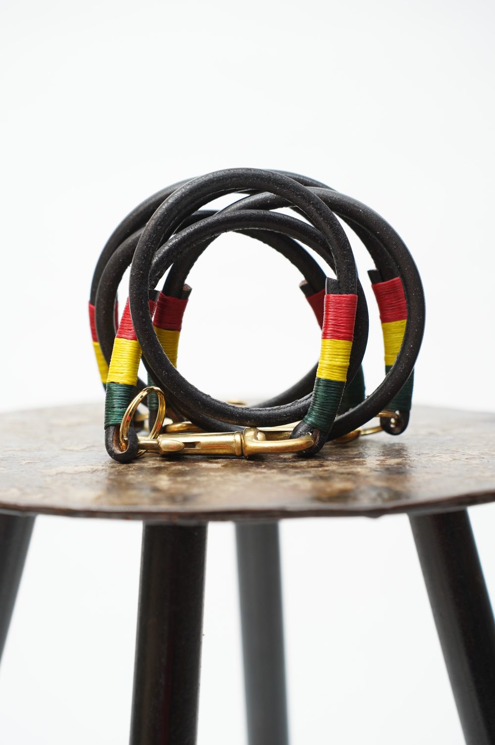 The Portmore collection Lanyard T1 with finishing details in the brand’s Jamaican heritage colours. It is constructed from 8mm leather belting cord and features a trigger hook and sprit ring.