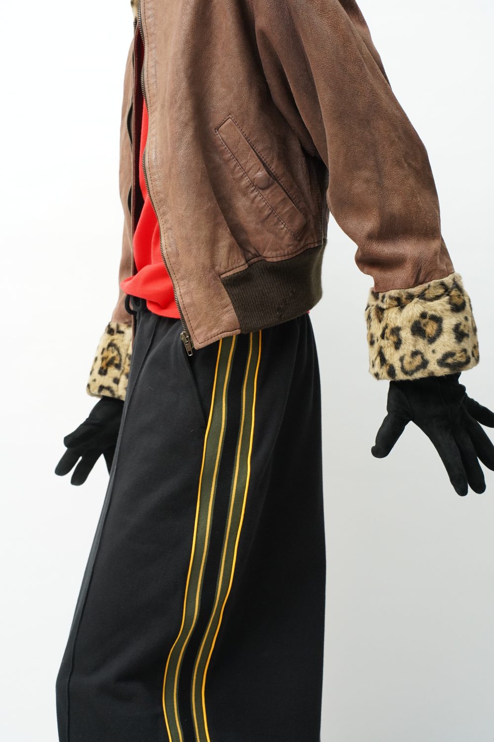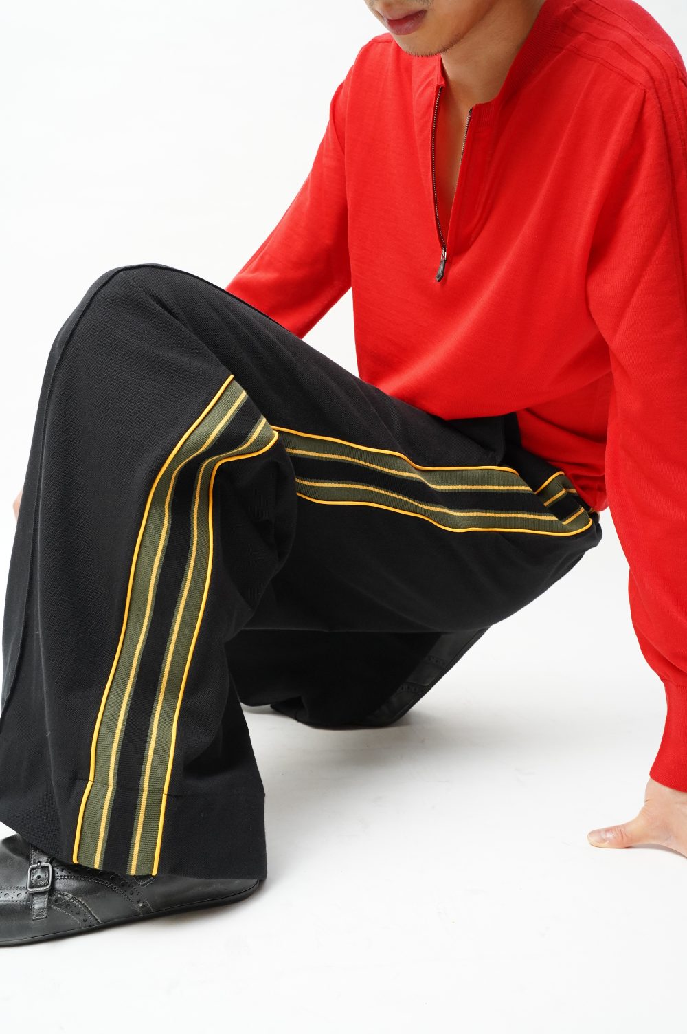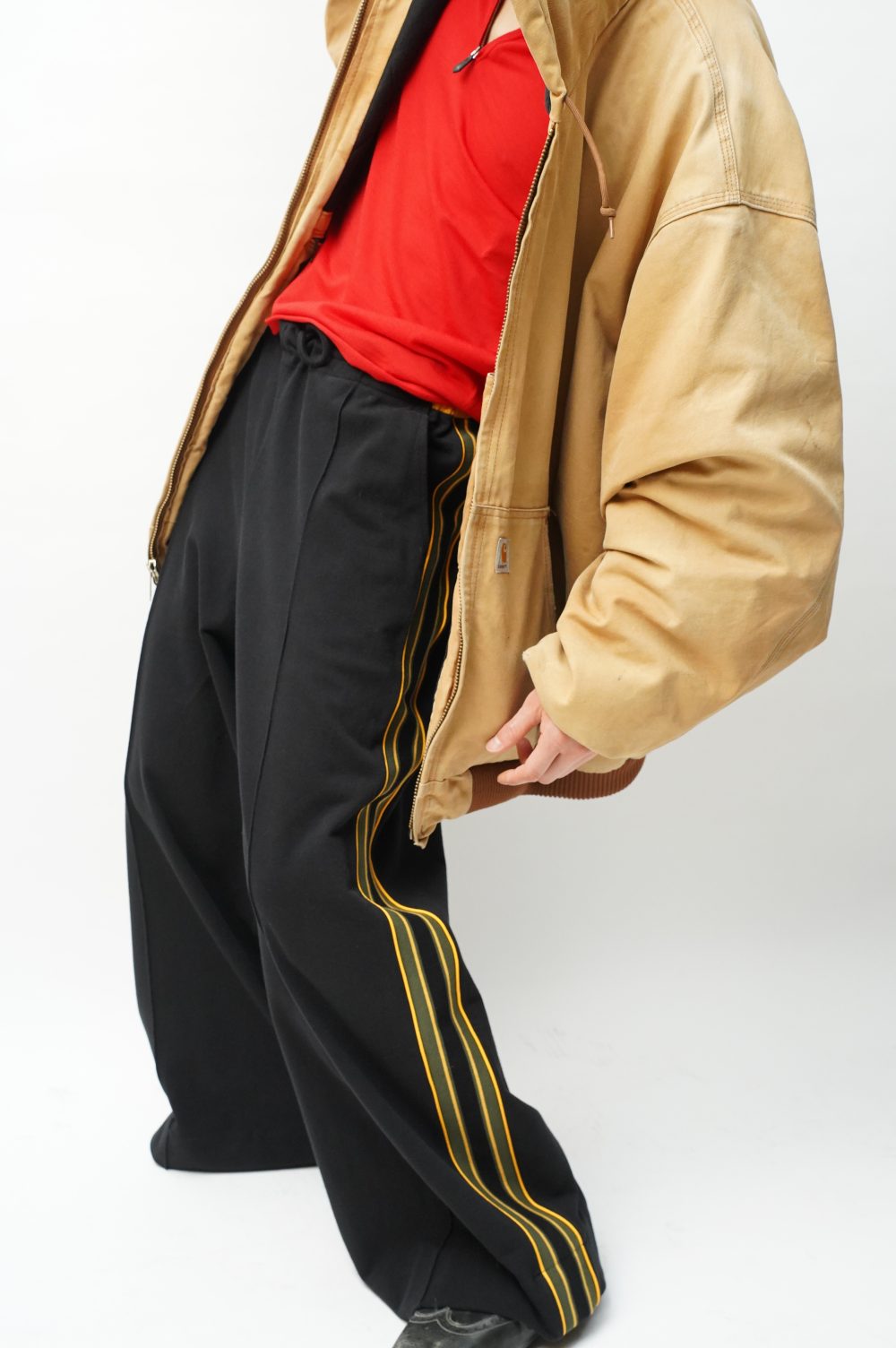 NICHOLAS DALEY、WIDE LEG TRACK PANT。 その名の通り、ワイドなレッグのトラックパンツ。カラーはBLACK。 程よい厚みのコットン。ここだけの話、年中穿けそうな感じです。内緒ですよ。 ズドンと太くて季節を選ばない着心地、それに加えてナイスカラーなサイドライン。 太いジャージとなると、褒め言葉しか思い浮かばないのがこの世の常。ジャージってどう考えてもユルいイメージなのに、なんというか、欠点がない。思わず「逆に」と言ってしまいたくなります。ずるい。ので欠点を探してとっちめてやりたいと思います。